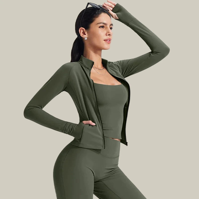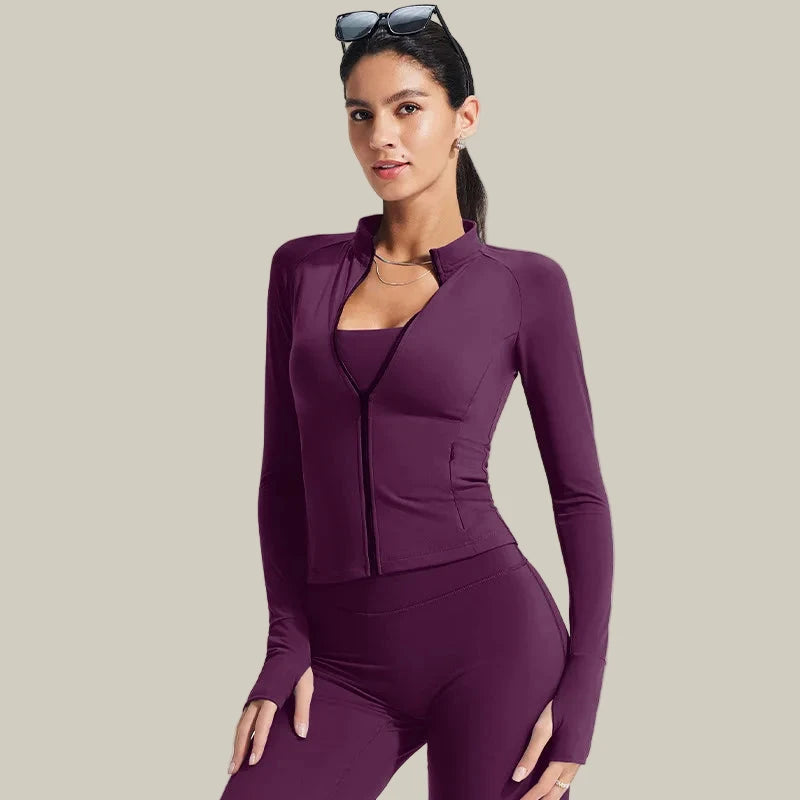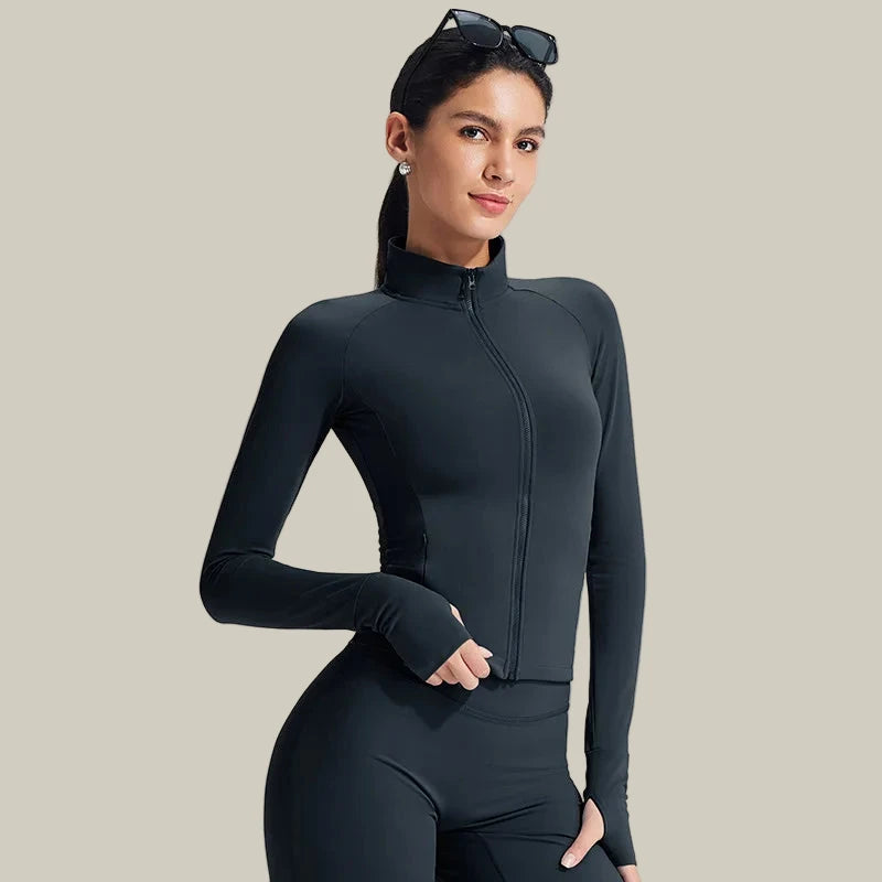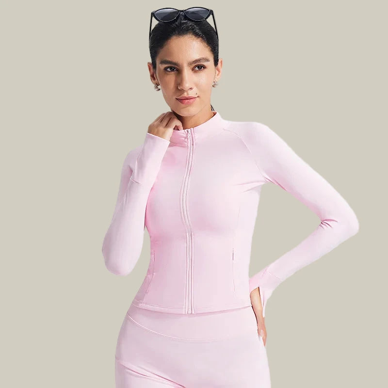 This long-sleeve zip jacket delivers a smooth, naked-feel fit with lightweight warmth and breathability. Made from a premium nylon–spandex blend, it stretches with your every move while keeping you cool and dry. Functional side pockets and a clean O-neckline complete its minimal silhouette — perfect for running, training, or layering on the go.