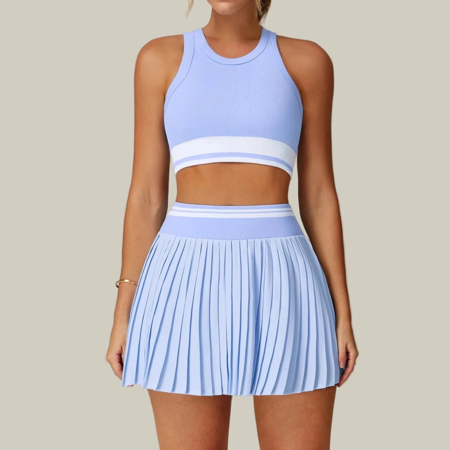 - Design: Two-piece set — sports bra + skirt with inner shorts