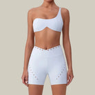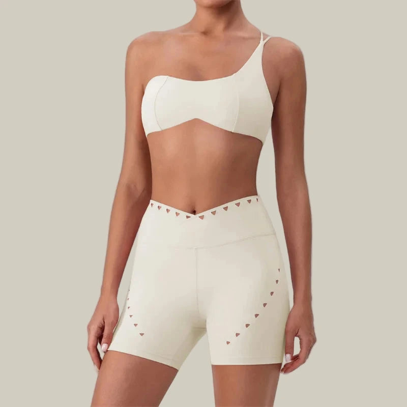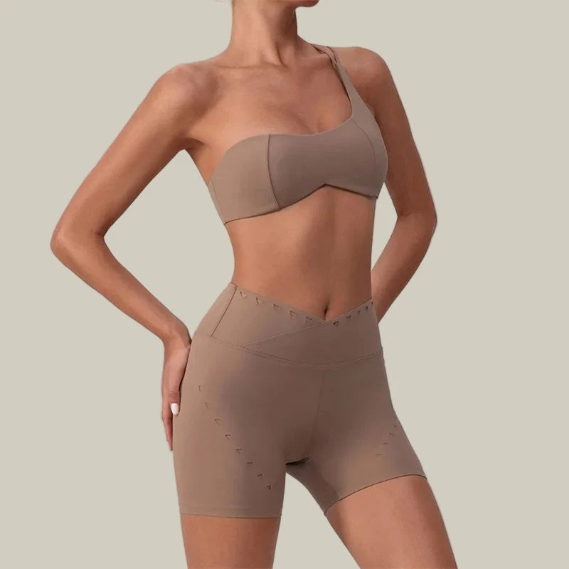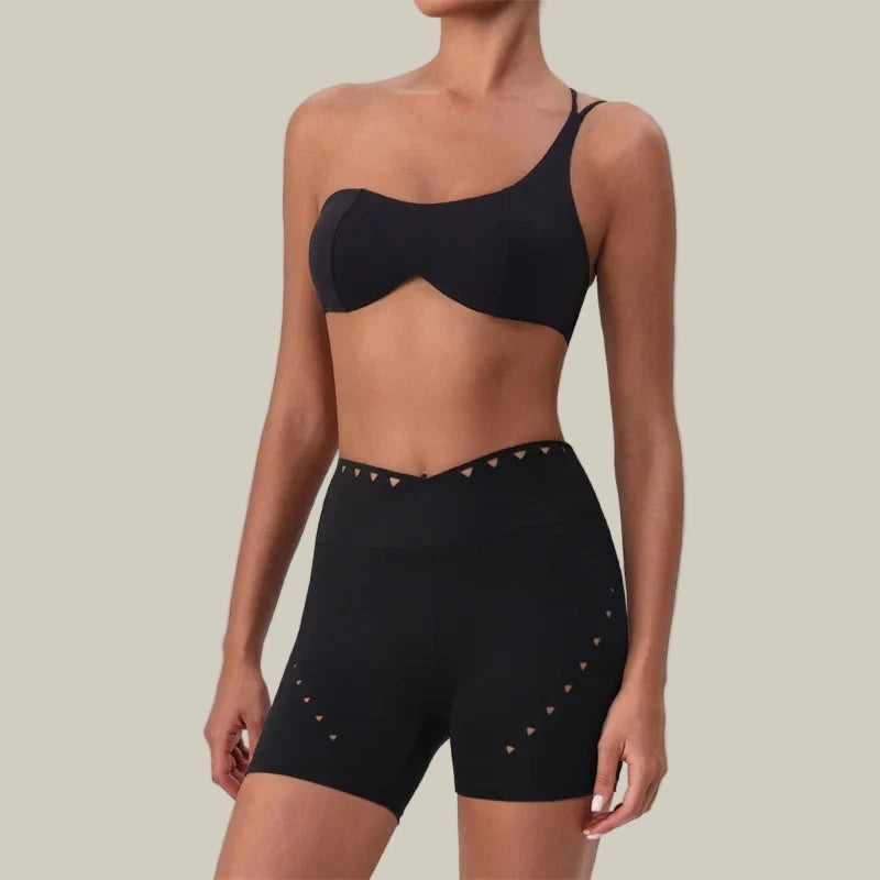 A sleek, sculpting set designed for effortless movement. Crafted from a soft nylon-spandex blend, it offers a smooth, second-skin feel with high stretch and breathability. The one-shoulder silhouette adds a touch of modern elegance — perfect for yoga, training, or everyday wear.