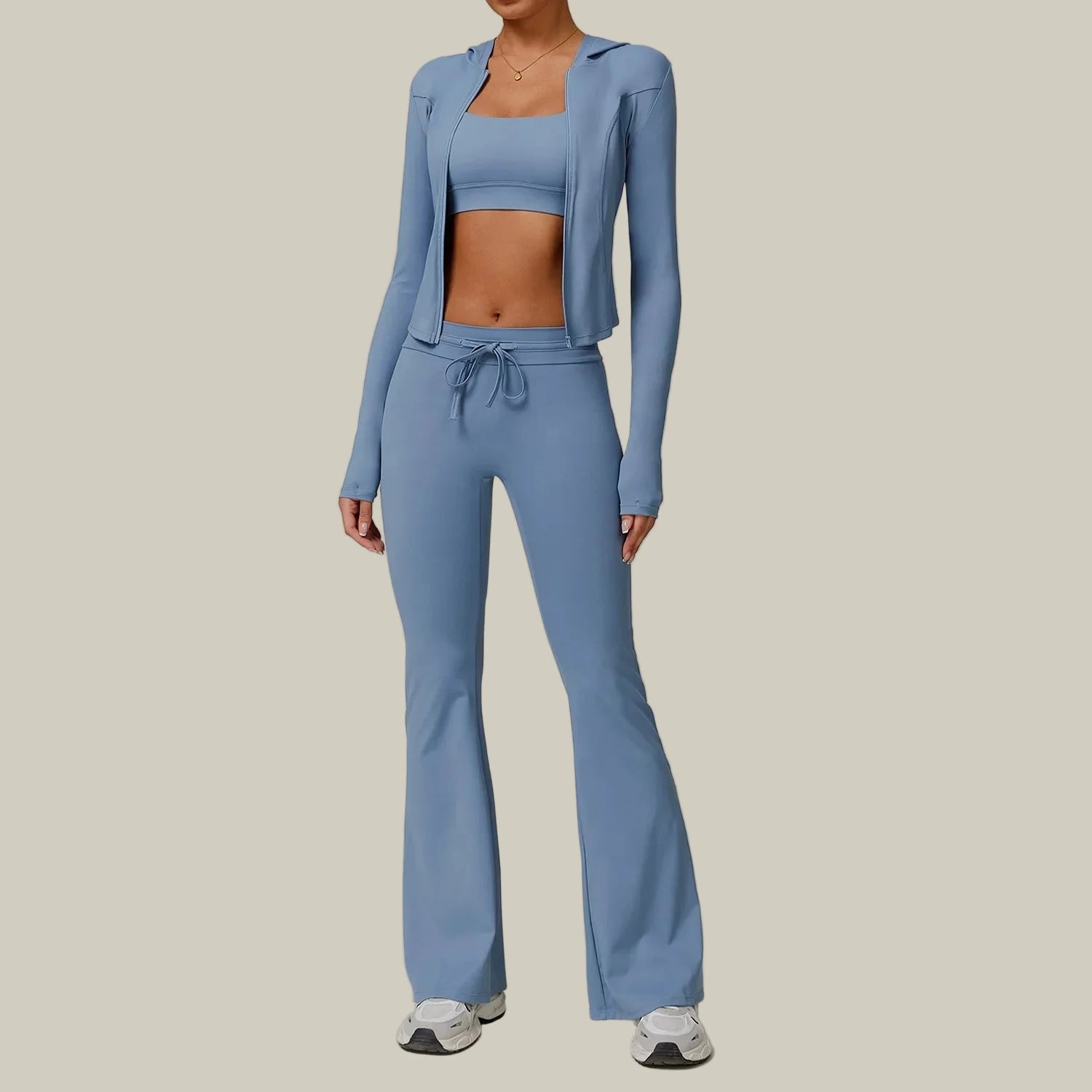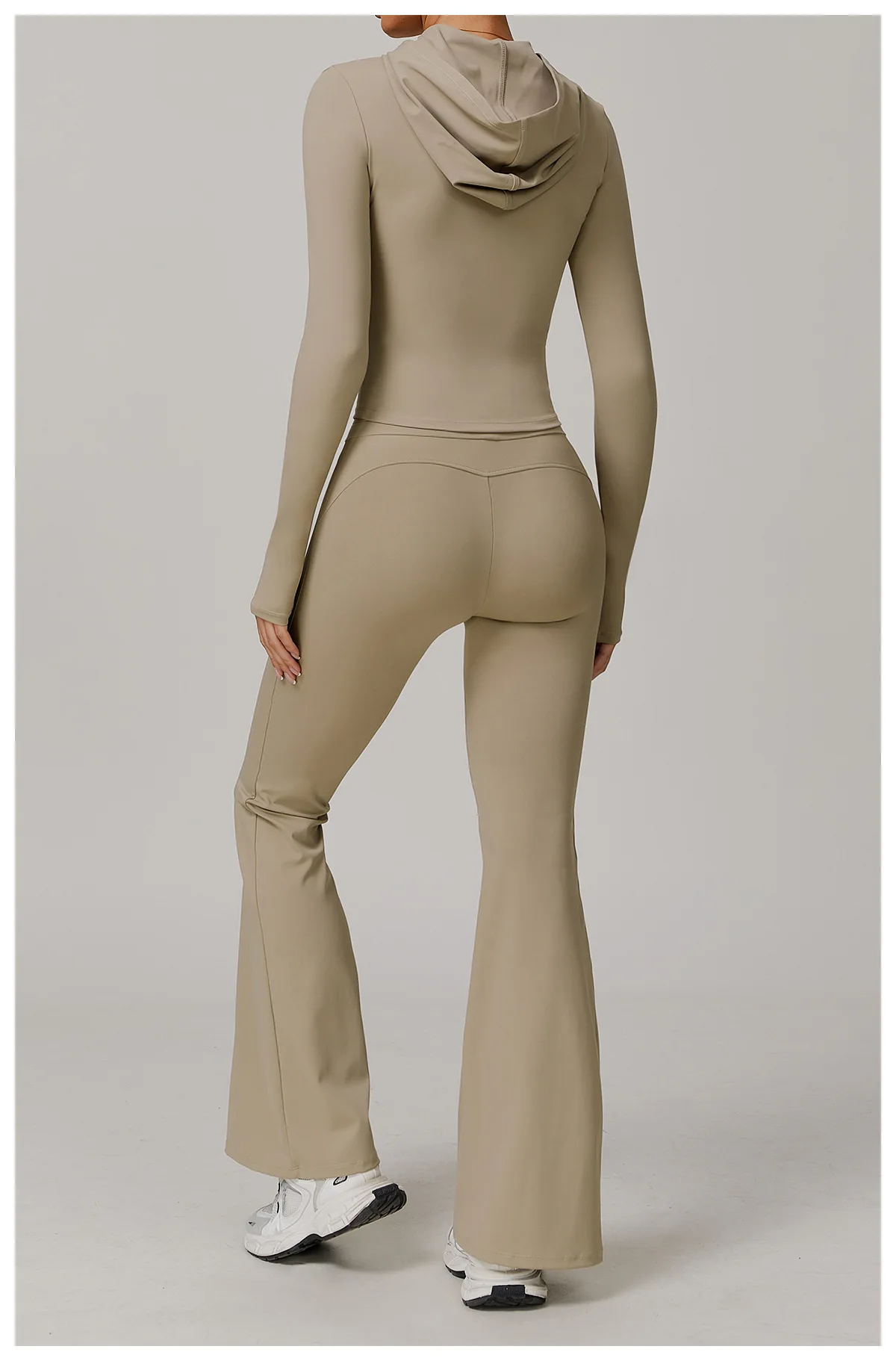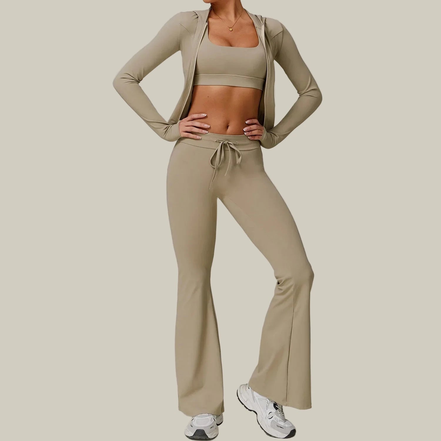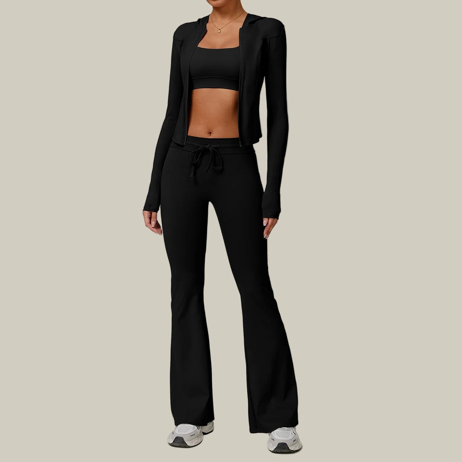 Confidence in motion. This two-piece yoga set pairs a sleek long-sleeve jacket with high-rise flare leggings for a refined, performance-ready look. Crafted from a soft, breathable polyester blend, it delivers lightweight comfort with moisture-wicking technology to keep you cool and dry. The contoured fit and four-way stretch move effortlessly with your body — perfect for yoga, running, or outdoor training. Minimalist, sculpting, and timeless — made to elevate every move.