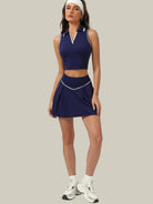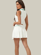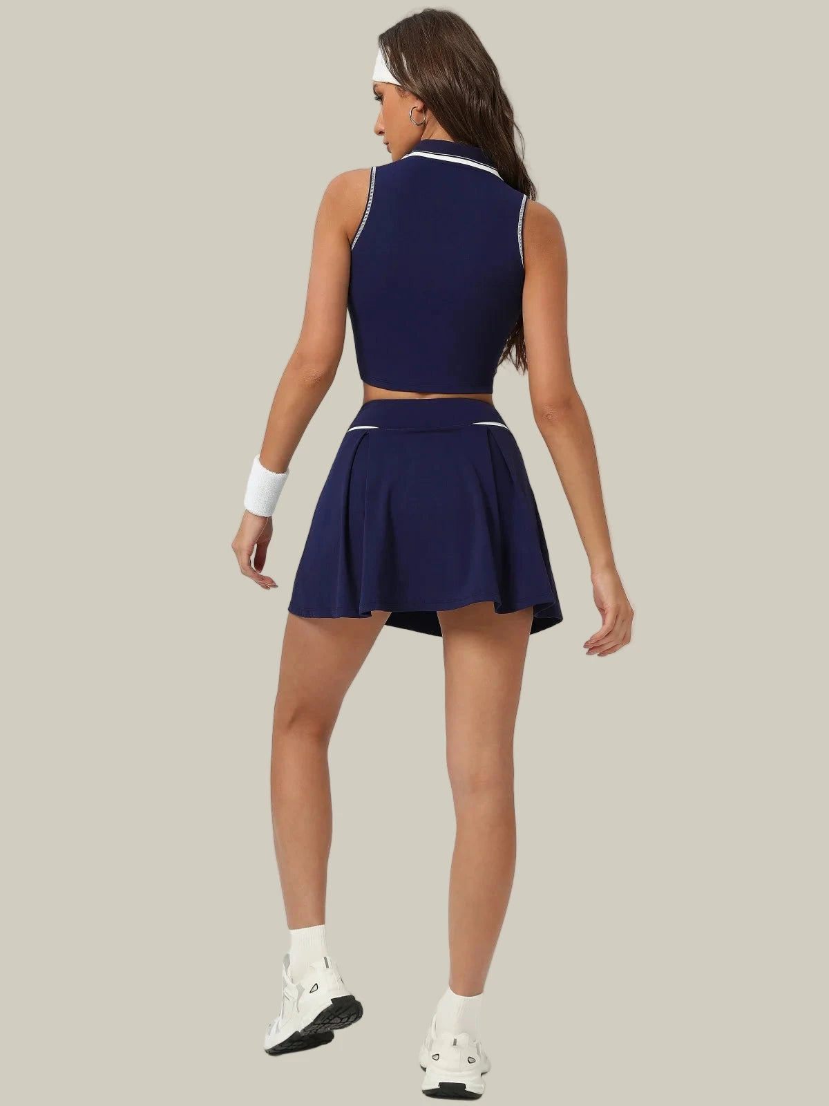 • Two-piece athletic set with polo collar vest and high-waist skirt