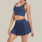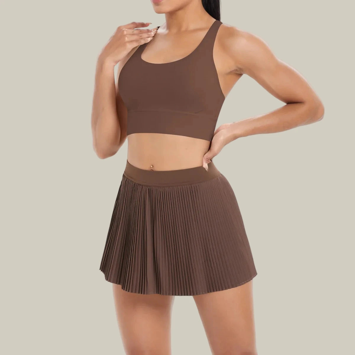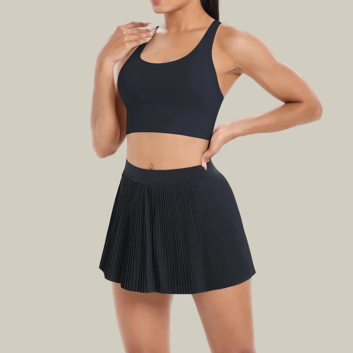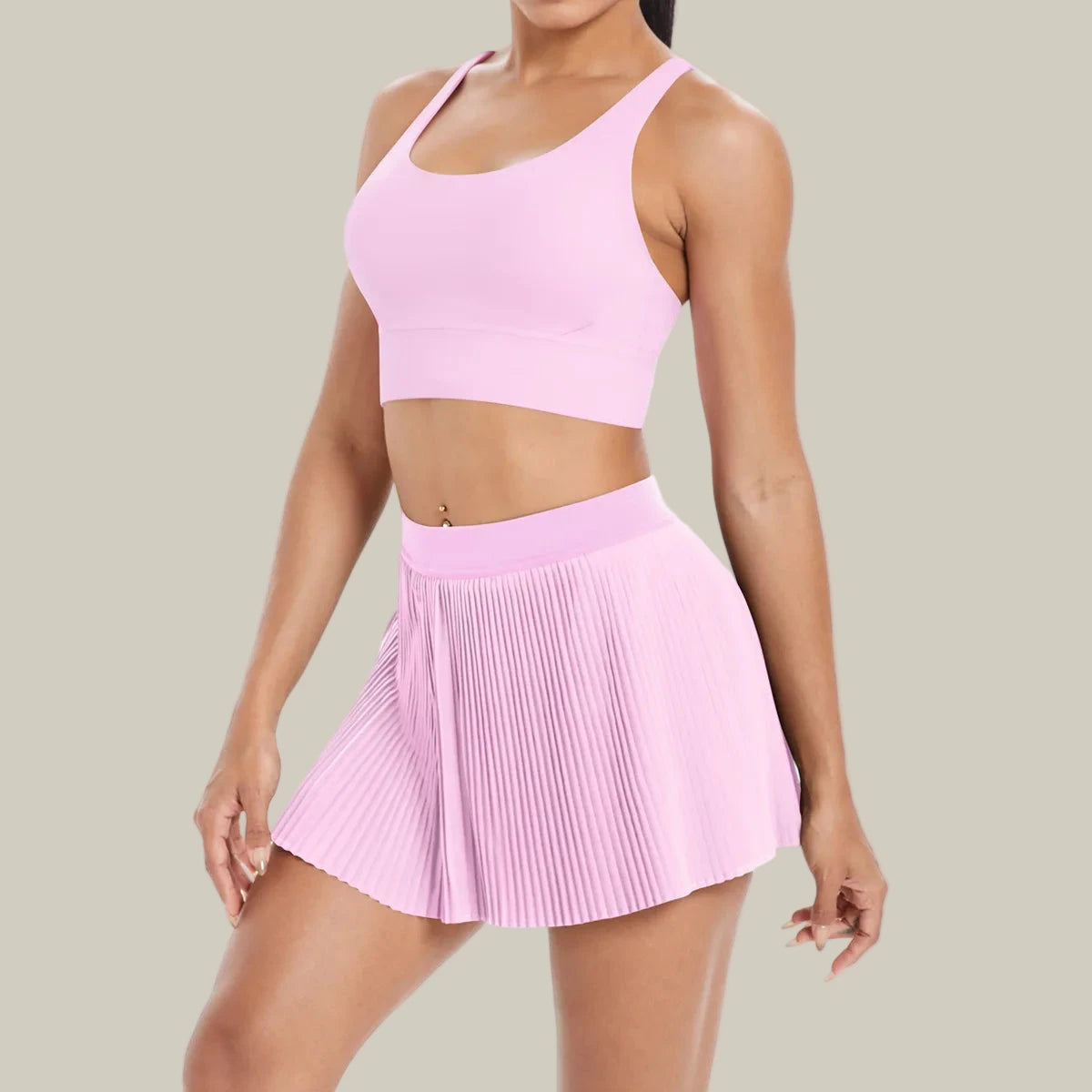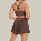 • Two-piece set: criss-cross sports bra + pleated tennis skirt with inner shorts